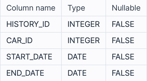 어느 자동차 대여 회사의 자동차 대여 기록 정보를 담은 CAR_RENTAL_COMPANY_RENTAL_HISTORY 테이블입니다. CAR_RENTAL_COMPANY_RENTAL_HISTORY 테이블은 아래와 같은 구조로 되어있으며, HISTORY_ID, CAR_ID, START_DATE, END_DATE 는 각각 자동차 대여 기록 ID, 자동차 ID, 대여 시작일, 대여 종료일을 나타냅니다.