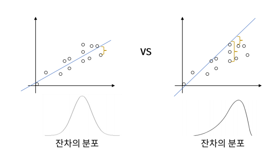 2. 등분산성 : 오차의 분산이 모든 수준의 독립 변수에 대해 일정해야 한다. 즉, 오차가 특정 패턴을 보여선느 안되며, 독립 변수 값에 상관없이 일정해야 한다.
