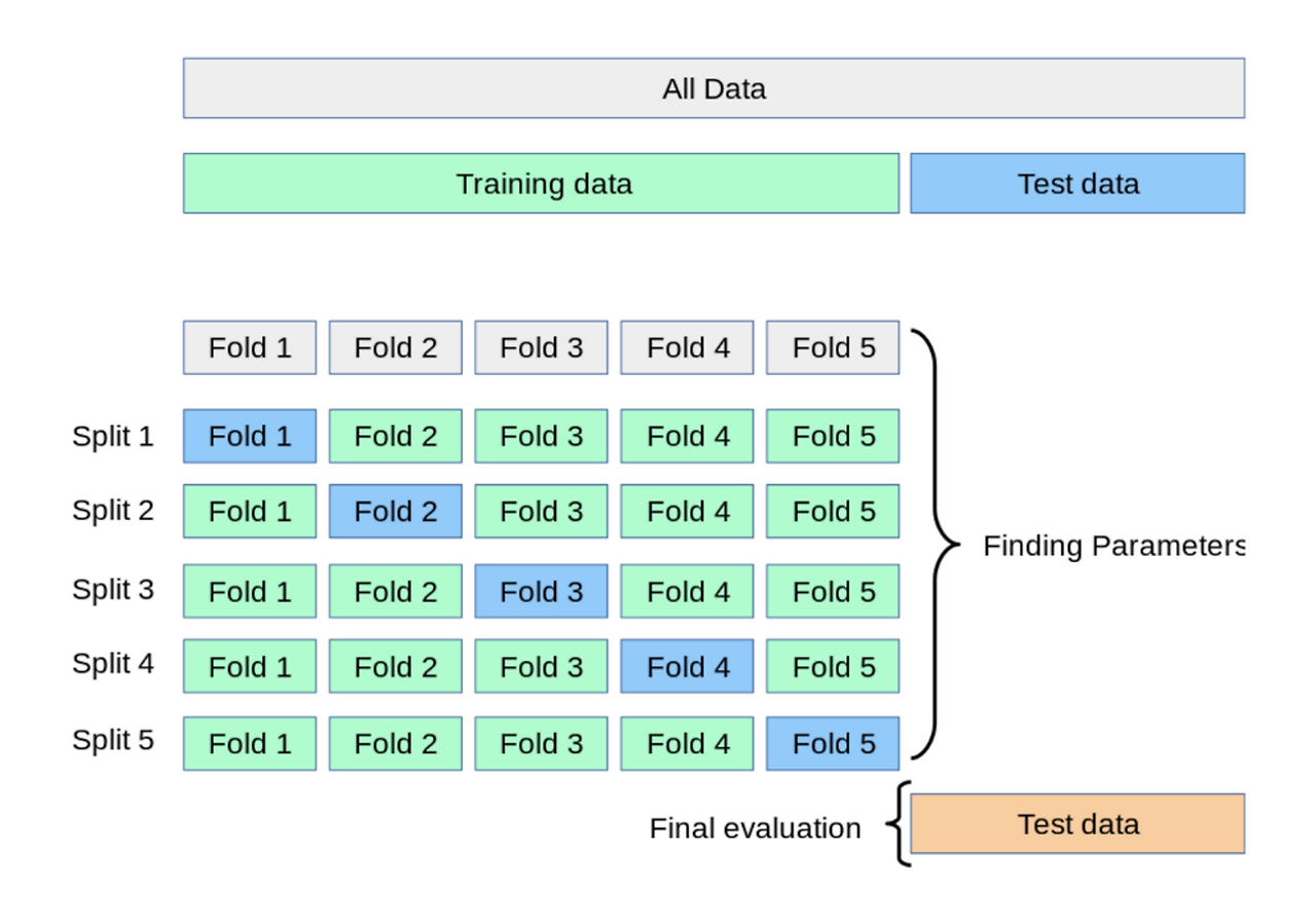 교차검증: 데이터 셋을 여러 개의 하위 집합으로 나누어 돌아가면서 검증 데이터로 사용하는 방법