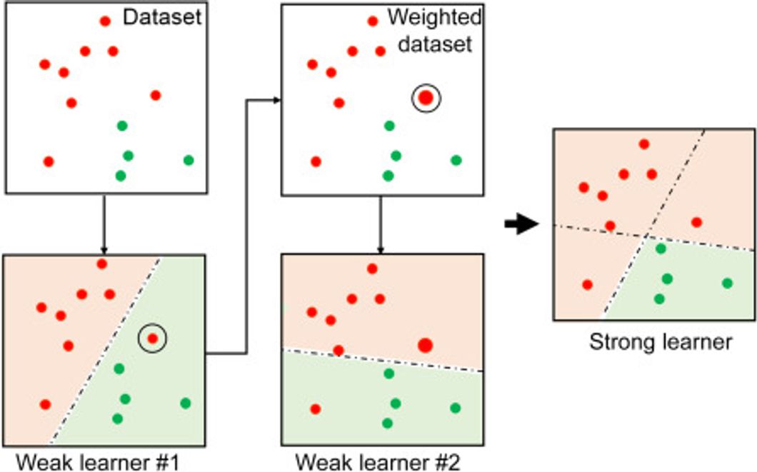 - 어러 개의 약한 학습기를 순차적으로 학습하면서 잘못 예측한 데이터에 가중치를 부여하여 오류를 개선해나가는 학습 방식
