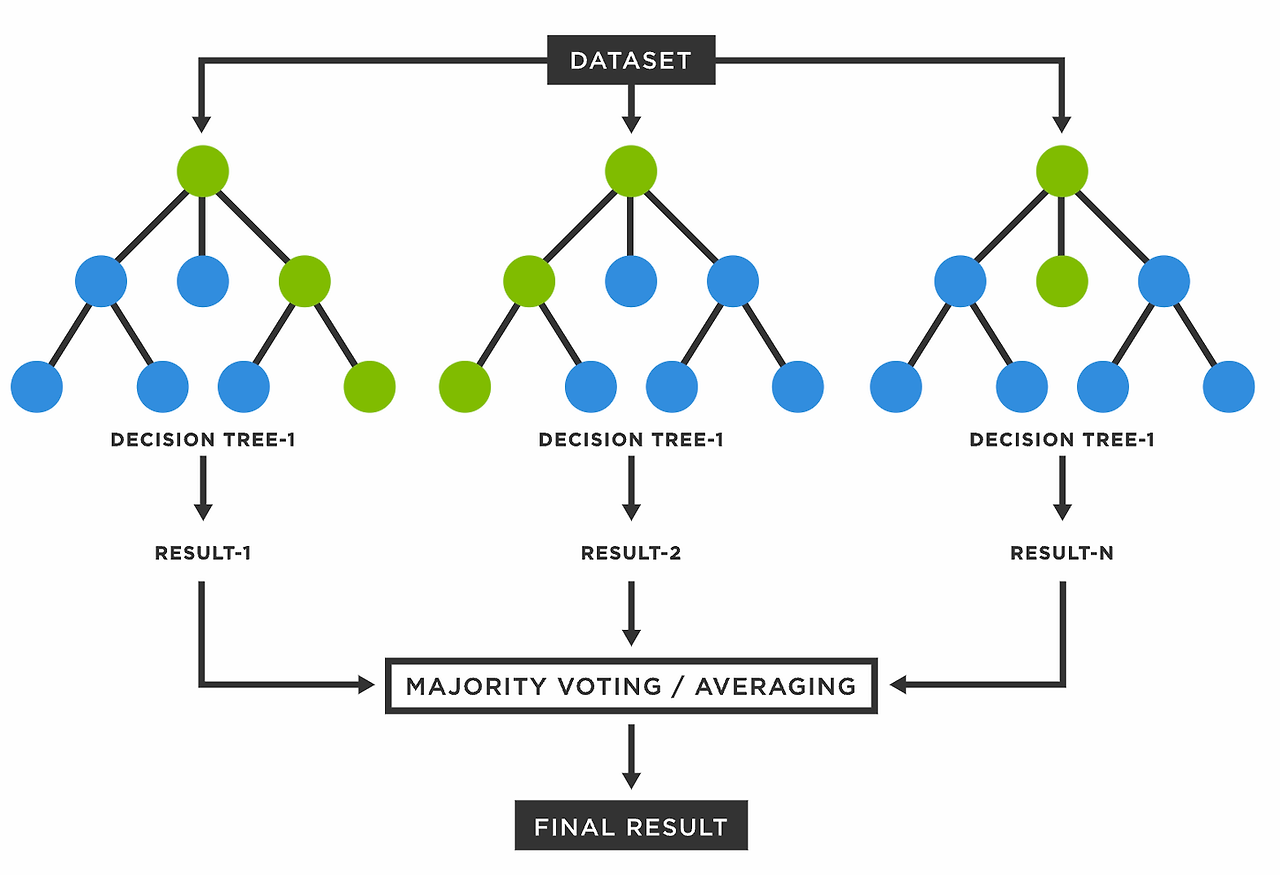 여러 개의 데이터 샘플에서 각자 의사결정트리를 만들어 다수결 법칙에 따라 결론 내림