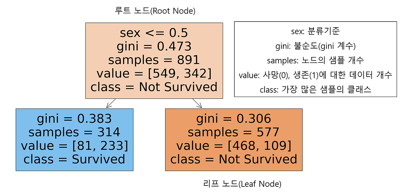 - 분류기준(criteria): sex는 여성인 경우 0, 남성인 경우 1로 인코딩. 여성인 경우 좌측 노드로, 남성인 경우 우측 노드로 분류