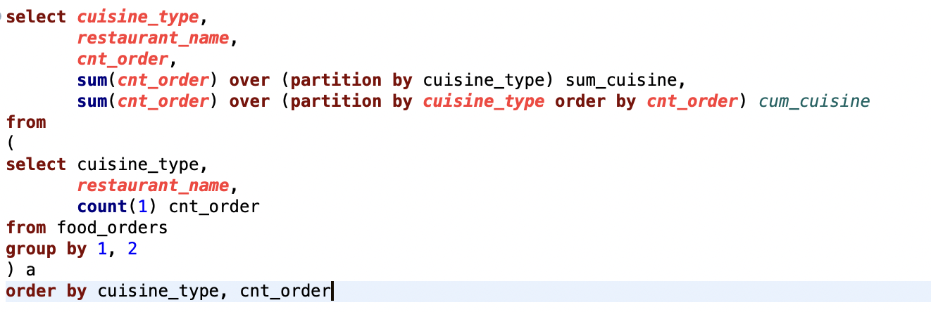 [실습] 각 음식점의 주문건이 해당 음식 타입에서 차지하는 비율을 구하고, 주문건이 낮은 순으로 정렬했을 때 누적 합 구하기