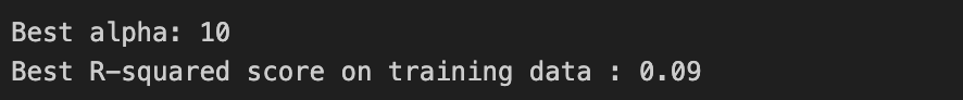 최적의 알파값은 10이 나왔지만 최적의 R-squared는 변동없이 작은 숫자인 0.09로 변함이 없었다.