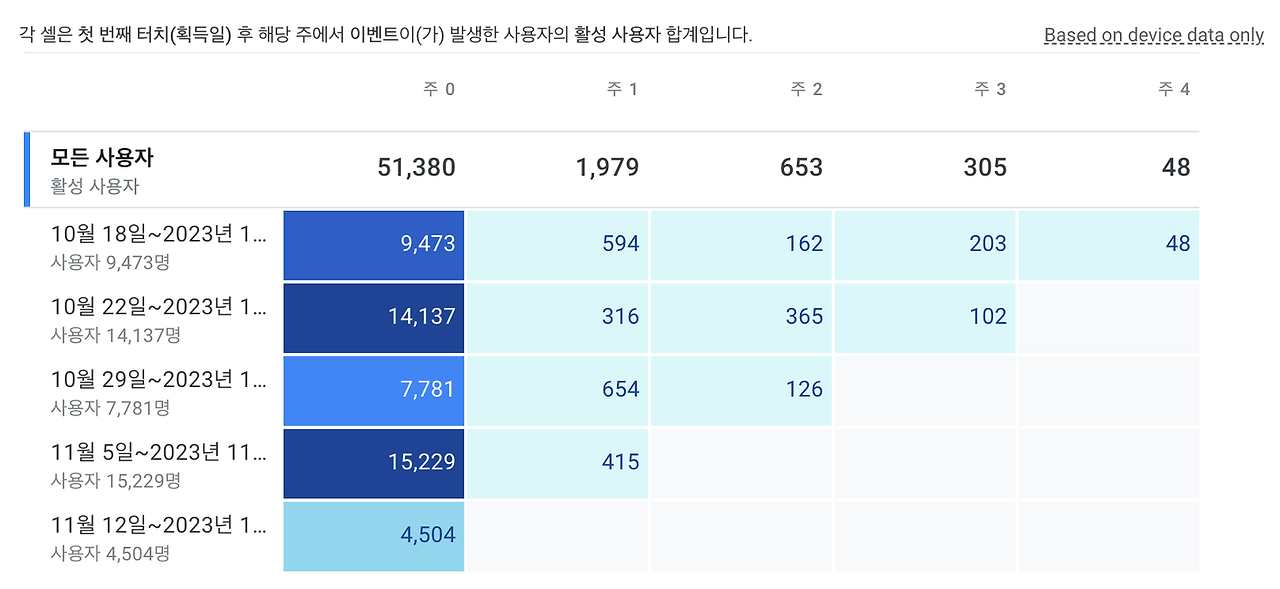 - 시간이 지남에 따라 어떤 코호트(=동질 집단)가 높은 리텐션을 유지하고 있는지, 어떤 코호트에서 하락이 나타나는지 확인