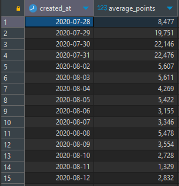 - average_points: 유저가 획득한 날짜별 평균 포인트(int), 반올림 필수
