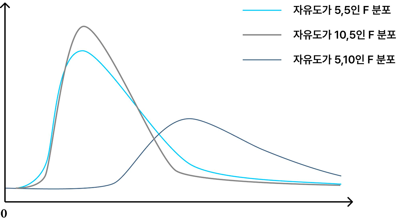항상 양의 값, 카이스퀘어 분포와 달리 자유도를 2개 가지고 있으며 자유도가 커질수록 정규분포에 가까워진다